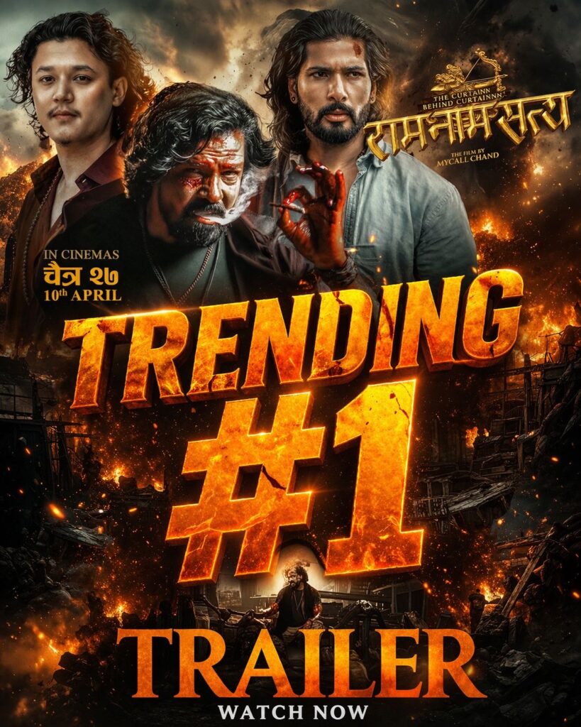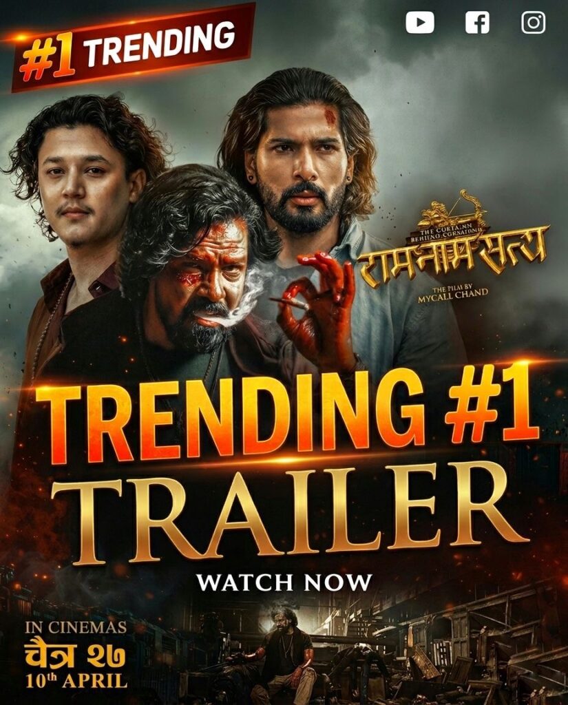 काठमाडौं । चैत्र २७ गतेबाट सोलो रिलिजमा आउन लागेको फिल्म ‘राम नाम सत्य’को सस्पेन्स, प्रेम र एक्सनले भरिएको ट्रेलर बुधबार सार्वजनिक गरिएको थियो । युट्युबमा सार्वजनिक भएसँगै यसले हंगामा मच्चाइरहेको छ । माइकल चन्दको कथा, पटकथा र लेखन रहेको यो फिल्मको ट्रेलरले सार्वजनिक भएको १ घन्टा ३० मिनेटमै युट्युबको सिनेमा विधा अन्र्तगत नेपालमा ८ नम्बरको ट्रेन्डिङमा पकड जमाएको थियो ।